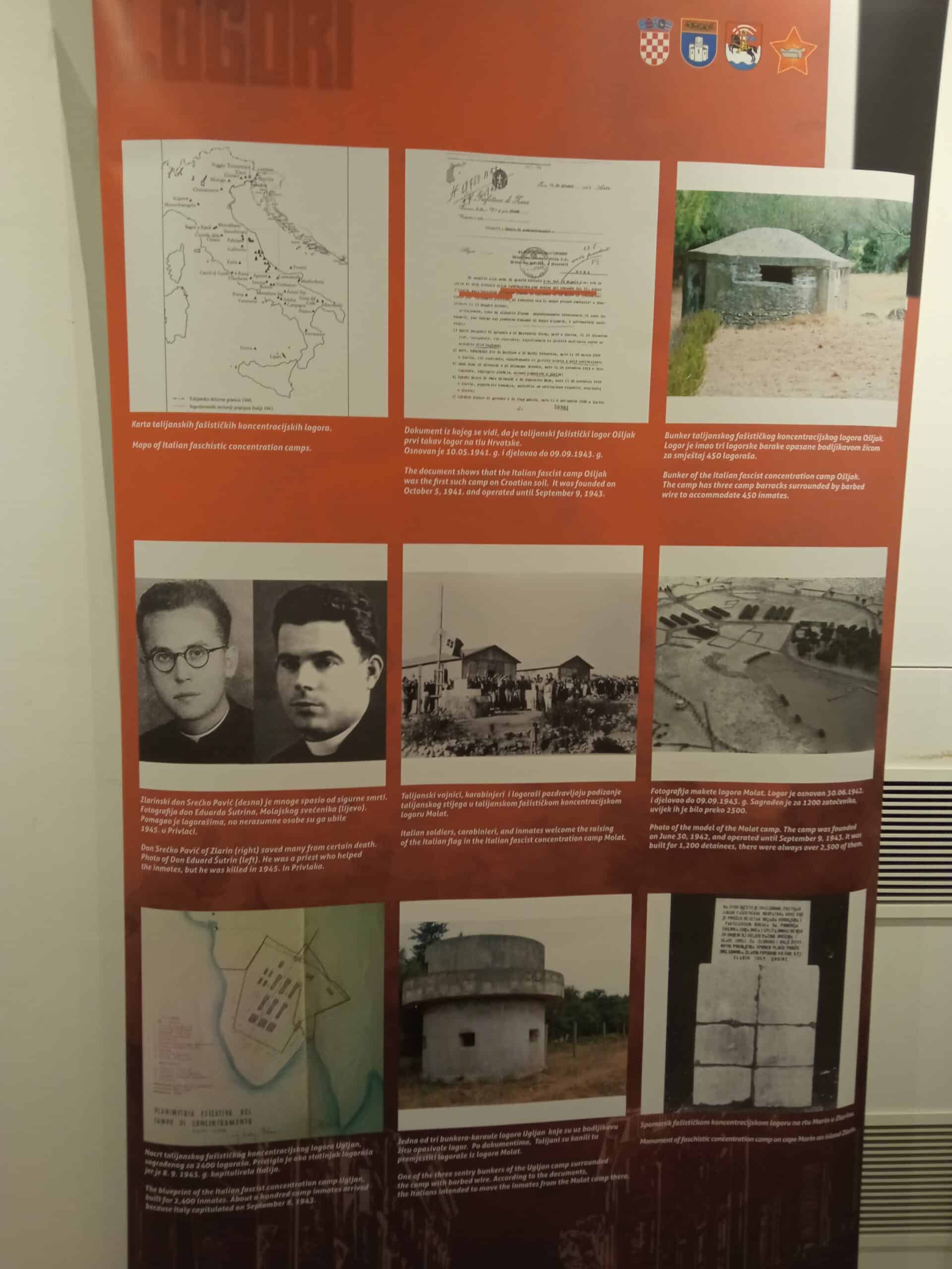 U prve dvije dvorane kao zamjena za stalni muzejski postav nalaze se izložbe Mussolinijevi fašistički koncentracijski logori za civile Hrvatskog primorja i Mussolinijevi fašistički koncentracijski logori za civile sjeverne Dalmacije.