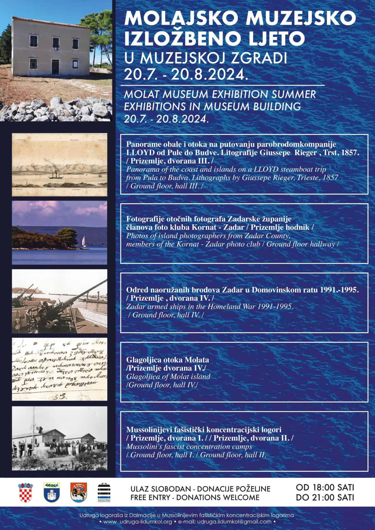 Molajsko muzejsko izložbeno ljeto ove godine otvoreno je 20. srpnja s tri izložbe: “Mussolinijevi fašistički koncentracijski logori Hrvatskog primorja i sjeverne Dalmacije”, “Glagoljica otoka Molata” i Fotografije otočkih fotografa zadarskog arhipelaga foto kluba Kornat/Zadar.